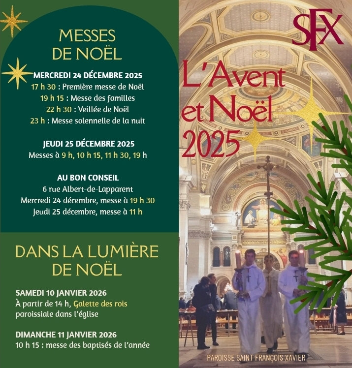 Les jeudis de l'Avent à 7h15 à SFX (4,11 et 18 déc.). Cette messe particulière, célébrée à la lueur des bougies, est typique de l’Avent. C'est la messe des veilleurs de l’aurore.